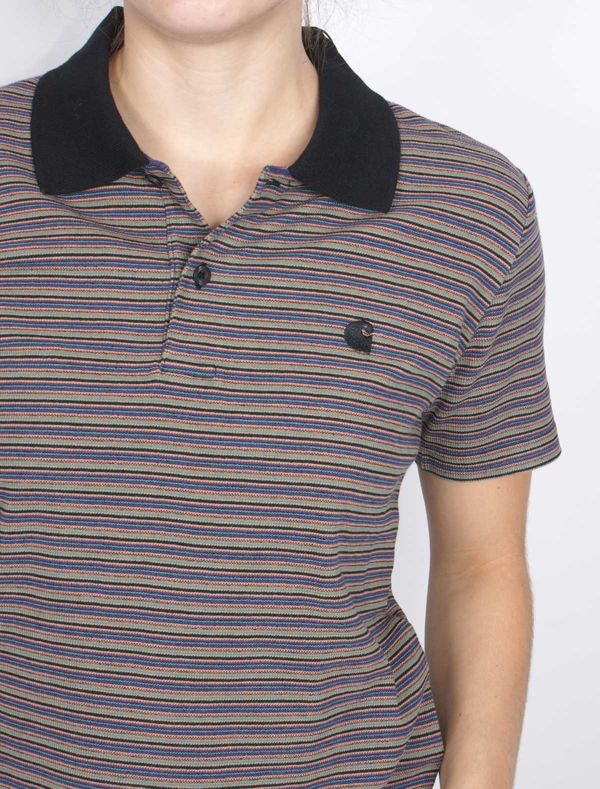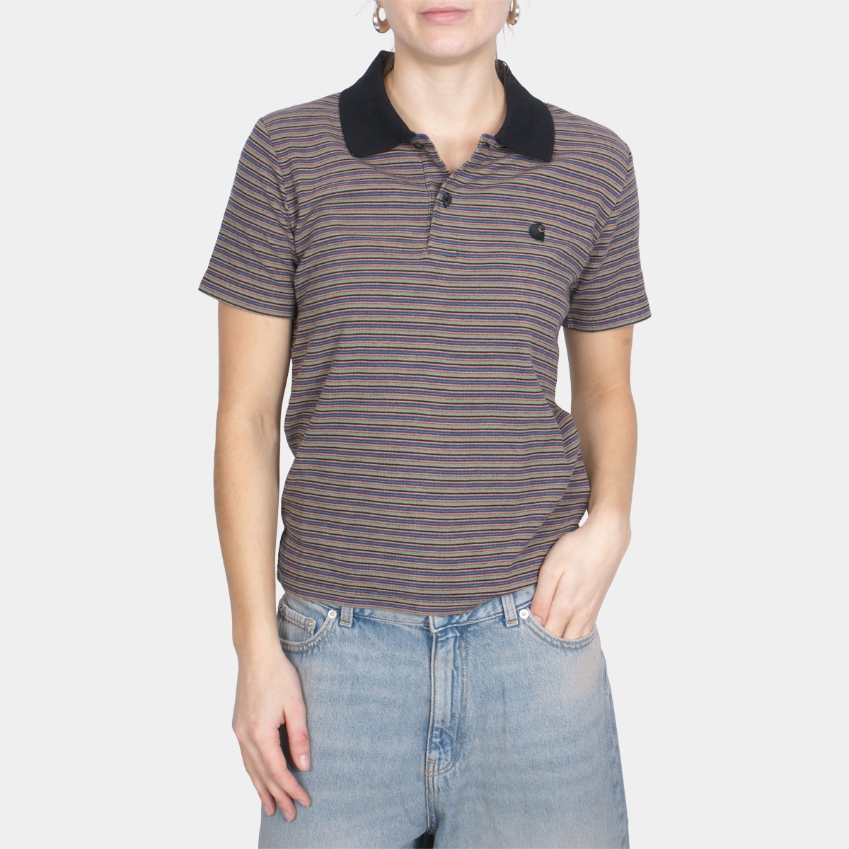 Women's S/S Dion Polo er fremstillet i en slim fit i struktureret bomulds-waffle med gennemgående striber. Poloen har en kontrastfarvet krave og en halv stolpelukning med knapper. Et broderet ‘C’-logo på brystet fuldender designet. Modellen er 168 cm og er fotograferet i str small Se hele udvalget fra Carhartt wip i vores butik i Holstebro