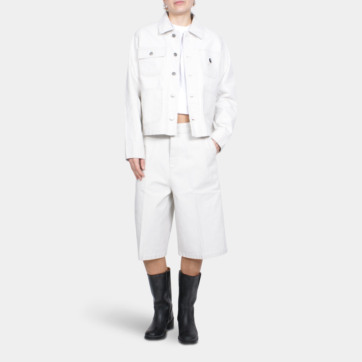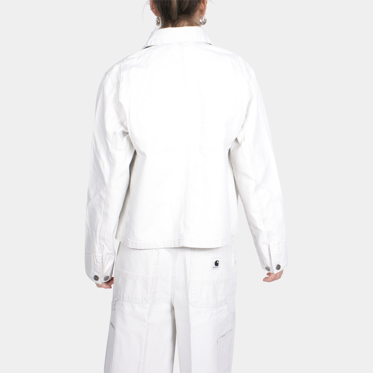Women's Mercer Chore Coat er fremstillet i kraftig, uforet bomuld med gennemgående hickory-striber. Jakken har fire frontlommer, hvoraf én har klap med knaplukning. Den er desuden forstærket med bartack-syninger på udsatte belastningspunkter. Et vævet Square Label fuldender designet. Modellen er 168 cm og er fotograferet i str small