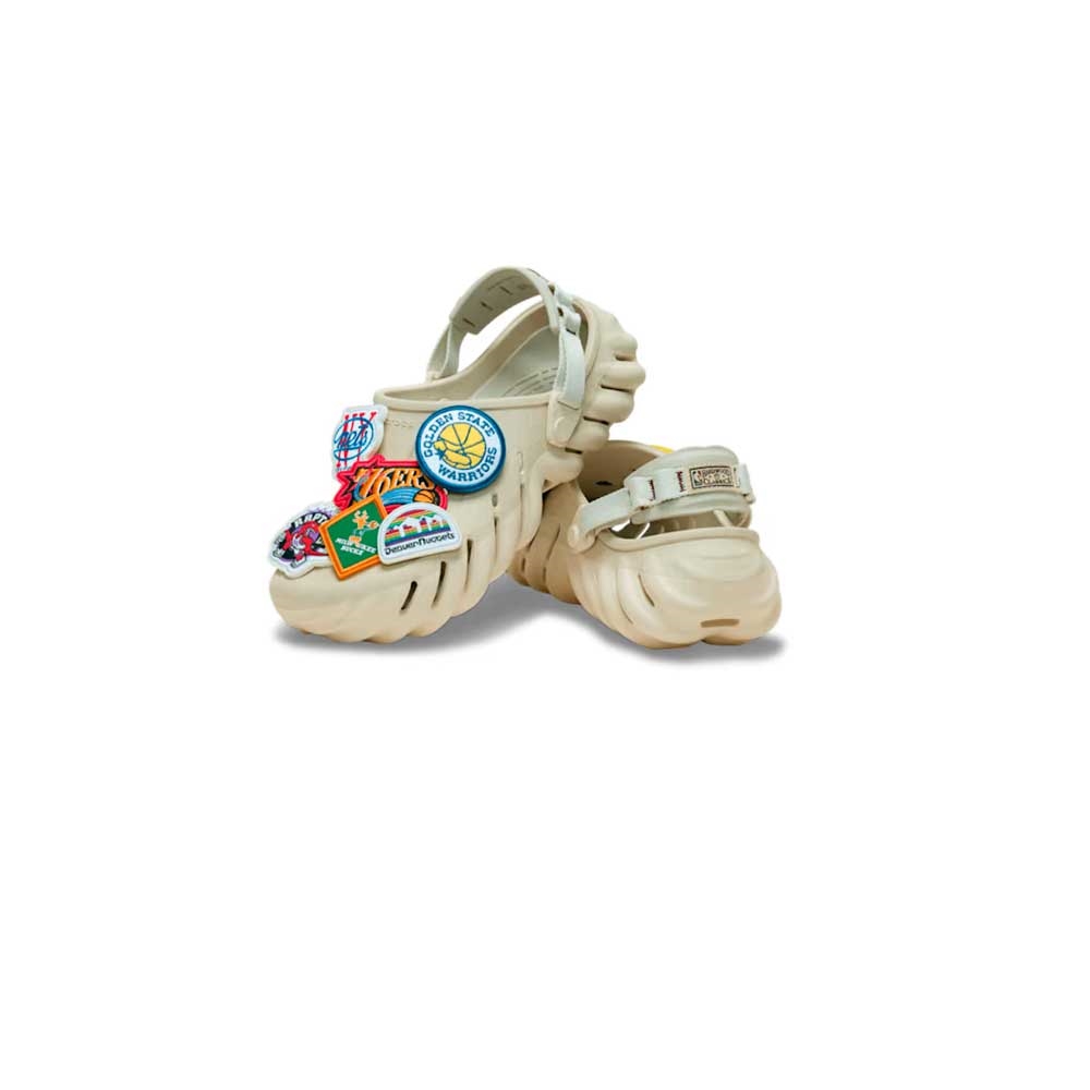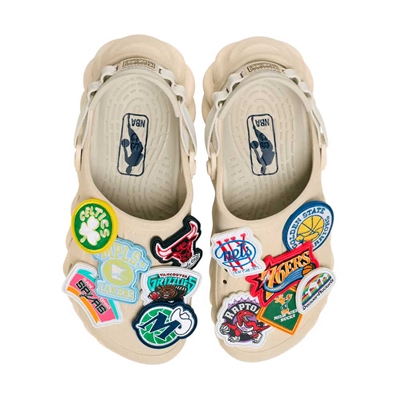 Detaljer om NBA Echo Clog: 12 retro team Jibbitz™ charm patches medfølger Utrolig lette og nemme at have på Fuldt støbt Croslite™ overdel og base Vandvenlige og flydende; vejer kun få gram Ventilationshuller giver åndbarhed og hjælper med at lede vand væk Nemme at rengøre og tørrer hurtigt Hælpude på bagremmen for ekstra komfort Kan tilpasses med Jibbitz™ charms Dobbelt densitet med Croslite™ sål og LiteRide™ fodseng