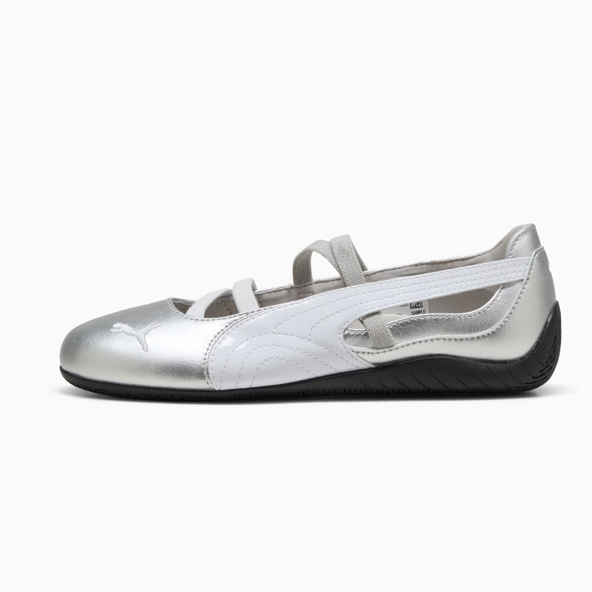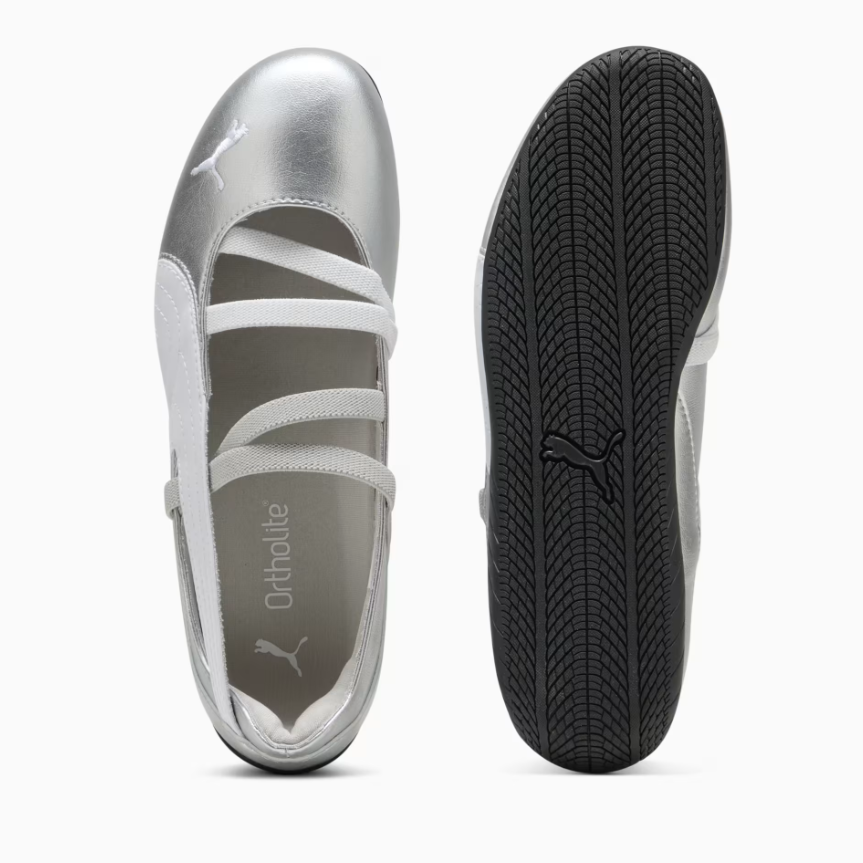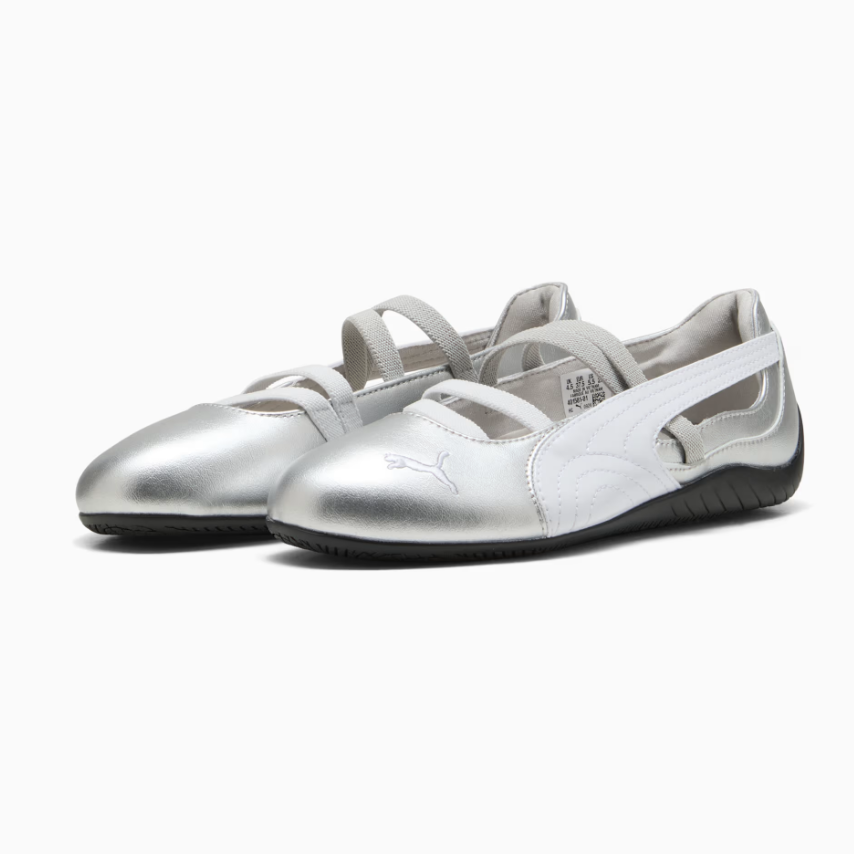 An icon of racing culture, the PUMA Speedcat has been synonymous with speed, precision, and unparalleled performance for over 25 years. It originated as a fireproof Formula 1® footwear style, but over the decades it found itself on a new circuit – transcending the tracks of Monaco for the streets of global fashion capitals. Merging ballet elegance with that original racing DNA, the Speedcat Ballet features a metallic upper, embroidered PUMA cat, and elastic bands for a snug fit. Embrace the low-profile trend with this iconic PUMA silhouette.