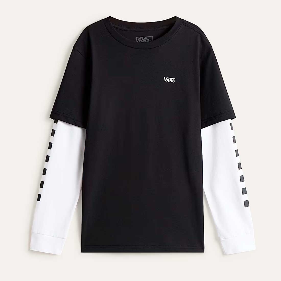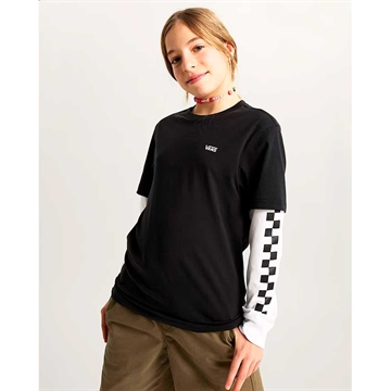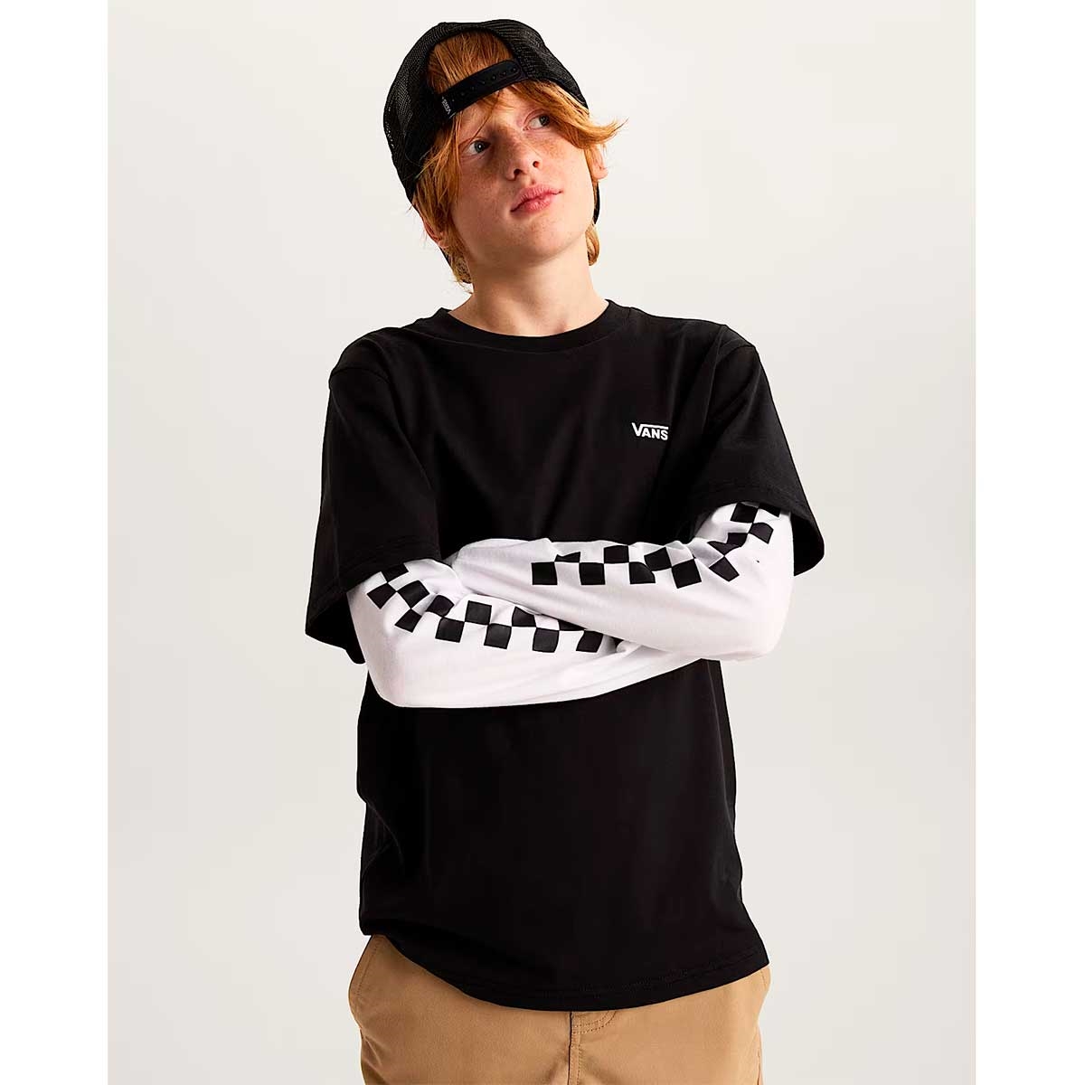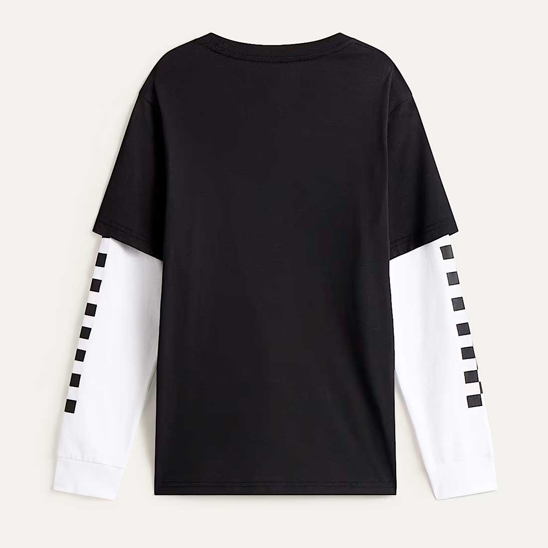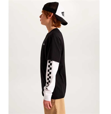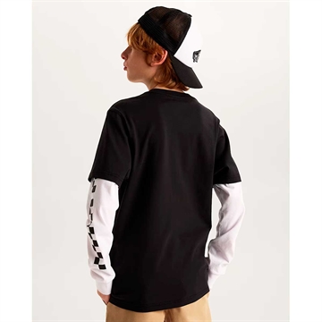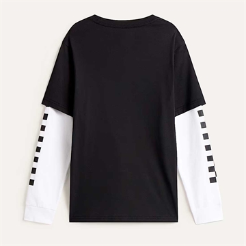 Sort / hvid Vans junior langærmet t-shirt med de klassiske Vans tern ned ad ærmerne.