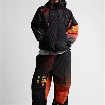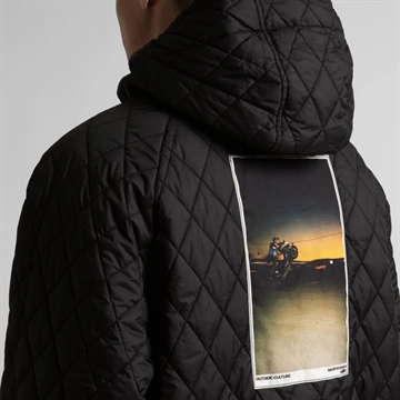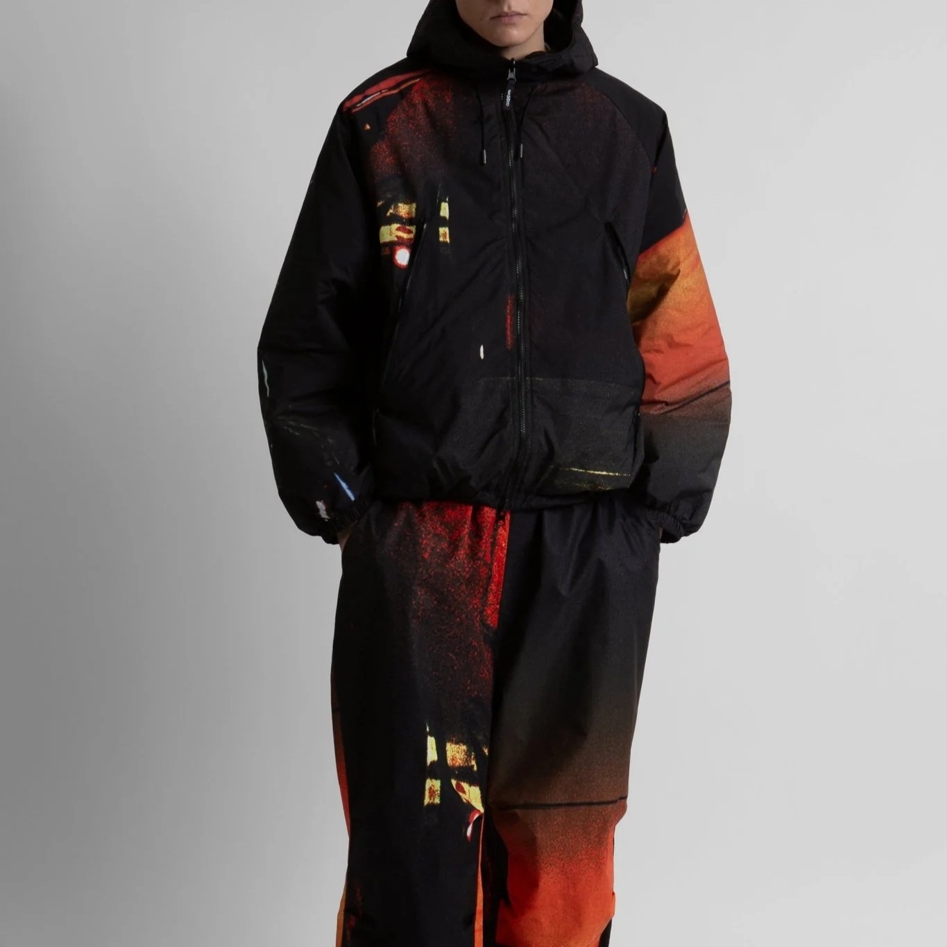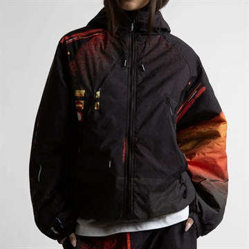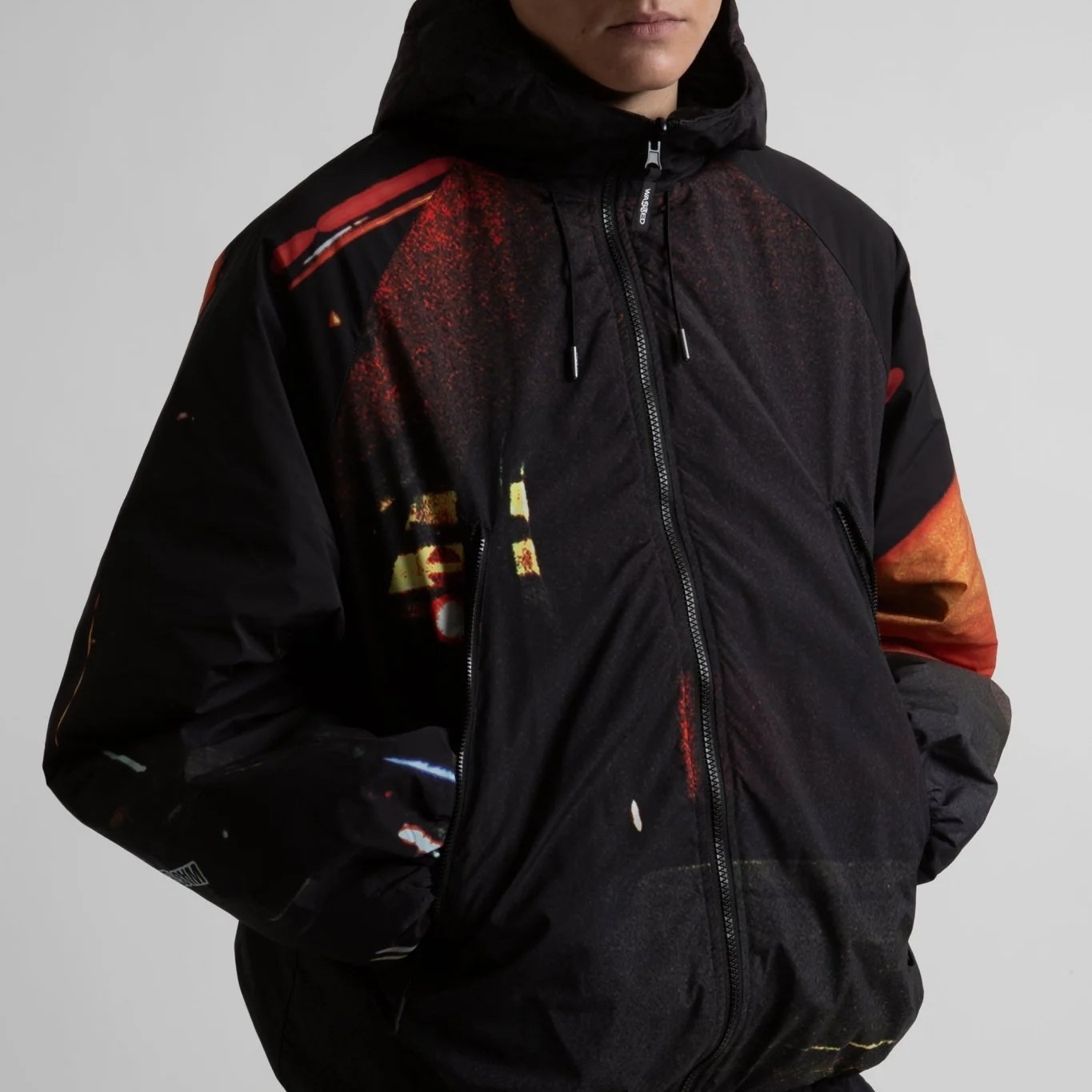 • Elastic drawstring with stopper at the bottom of the body and on the hood